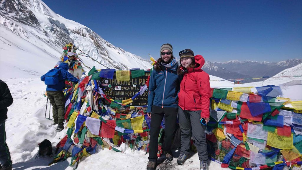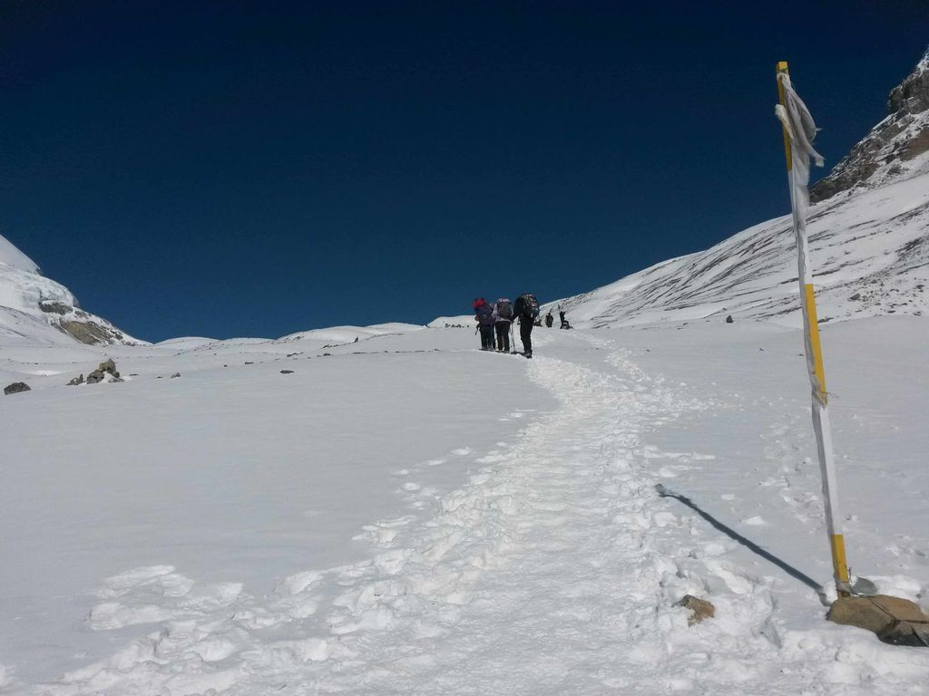 Der große Tag! Um 5.15 Uhr gab es Frühstück und um 6 Uhr mit Sonnenaufgang ging es dann los zum Pass! Dabei waren wir lange nicht die ersten, die ersten Trekker sind schon gegen 4 im High Camp oder unten in Thorong Phedi gestartet. Gute 4 Stunden ging es Berg hoch durch den Schnee zum Pass. Dort haben wir dann eine kurze Teepause eingelegt und das obligatorische Foto gemacht.