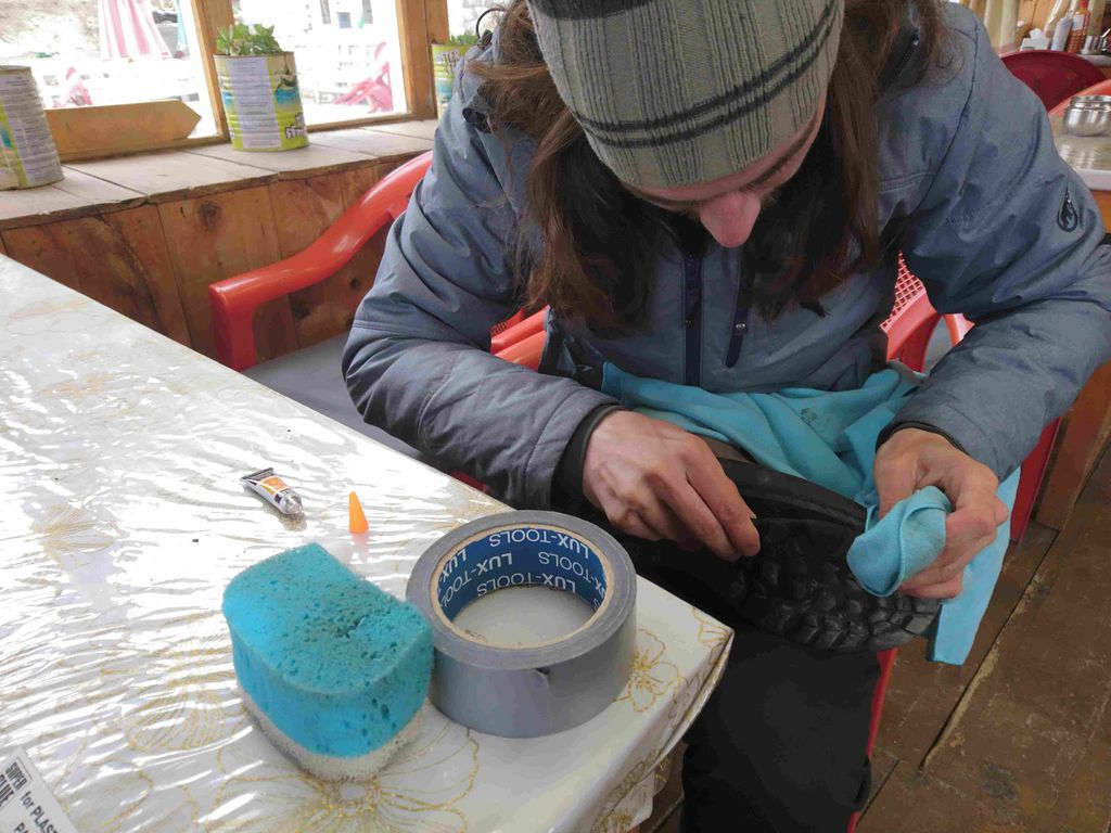Hier ist uns aufgefallen, dass Jonas Schuhsohlen nur noch halb an den Schuhen hingen. Gut dass wir nicht mehr weiter wollten. Zum Glück gab es im Laden auch Sekundenkleber.