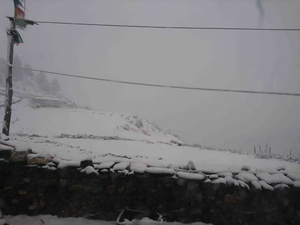 Der Rest des Weges war dann ein Spaziergang in der Höhe, nach 2 Stunden sind wir dann auch um 14 Uhr in Ngawal angekommen. Eine Stunde nach unserer Ankunft fing es dann an zu schneien. Die Gastgeber in der Lodge haben schnell den Holzofen im dining room angezündet, als einzige Gäste haben wir dann den Abend mit der Familie am Holzofen verbracht. Zu den Highlights gehörten ein nepalesischer Film im Fernsehen und die Vorbereitung der Gaben, die am nächsten morgen zum Tempel gebracht werden sollten.